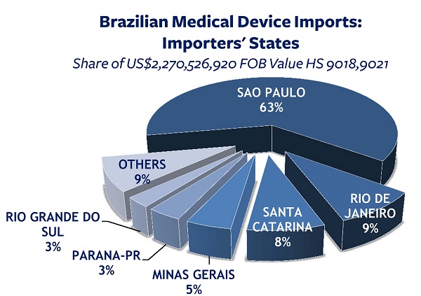 Our trade data on the South American healthcare market sector of medical devices confirms Brazil’s primacy as a destination, with $2.27 billion in imports in 2013 (more than three times the value of such imports to second-ranked Colombia), and São Paulo’s centrality within that market: