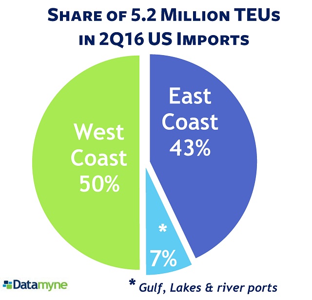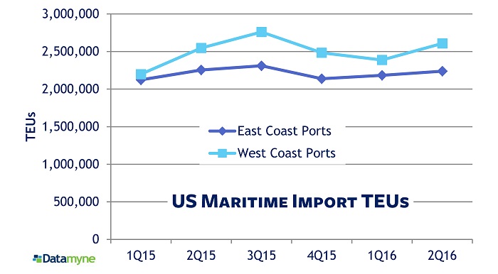 Early on in 2015, it seemed the East and West Coasts were on track to achieving parity in containerized import volumes. That shift in share of TEUs from the West to East now seems to have been largely the result of the West Coast’s labor woes. [See, for example, West Coast Ports Strike Back.] Our latest data shows a return to more traditional shares. The West Coast is clearly ahead in the second-quarter 2016 split of TEUs: