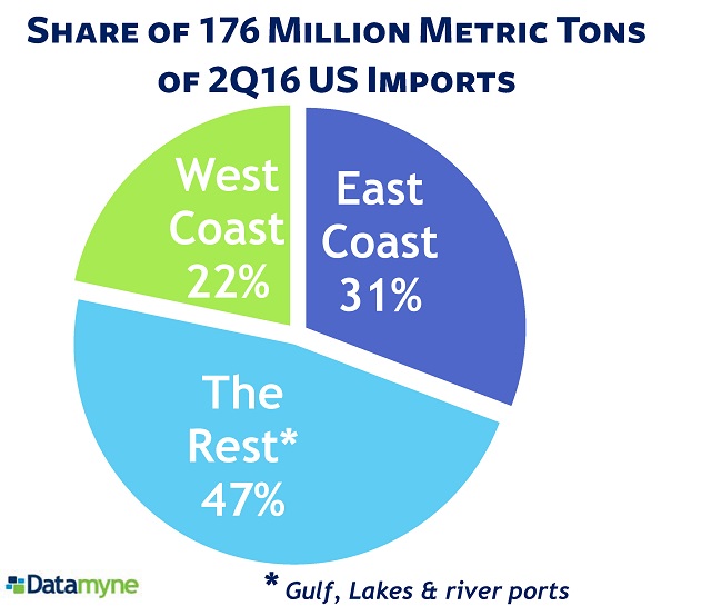 We’ll have to wait and see whether the neopanamax era sets the stage for the East Coast overtaking the West Coast ports’ share of import volumes … and we’ll keep tracking the quarterly data here. Just to put the West vs. East Coast TEU rivalry in perspective – this break-out of second-quarter imports by metric tons gives full due to the non-containerized imports handled by the Great Lakes and, especially, the Gulf ports: