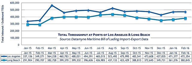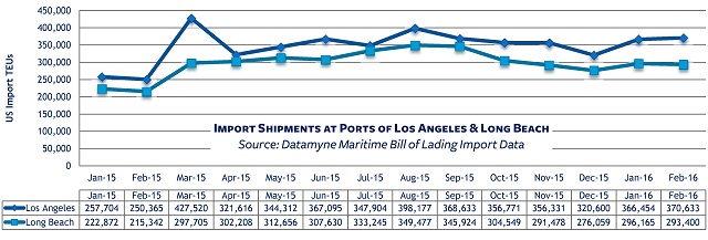 Port of Los Angeles import volumes, measured in TEUs (or 20-foot equivalent units), were up 48% in February compared with the same month a year ago. The top ranked port also saw export TEUs rise a modest 2.8% last month compared with February 2015.