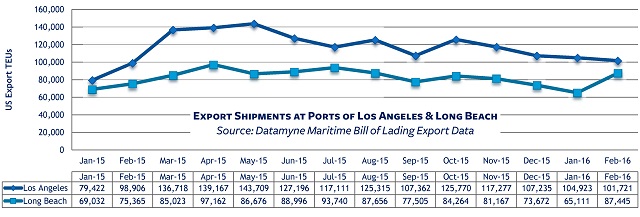 The pace of month-to-month gains has slowed – with the exception of Long Beach’s export TEUs, which climbed 34.3% from January to February.