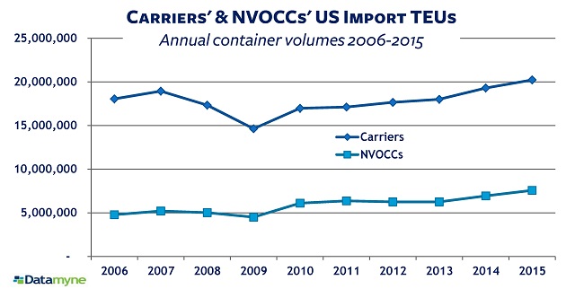 NVOCC US import TEU share reached 37.4% in 2015, a bump up from 2014’s share of 36.0%, and a 10 percentage point gain over 10 years, our trade data shows.