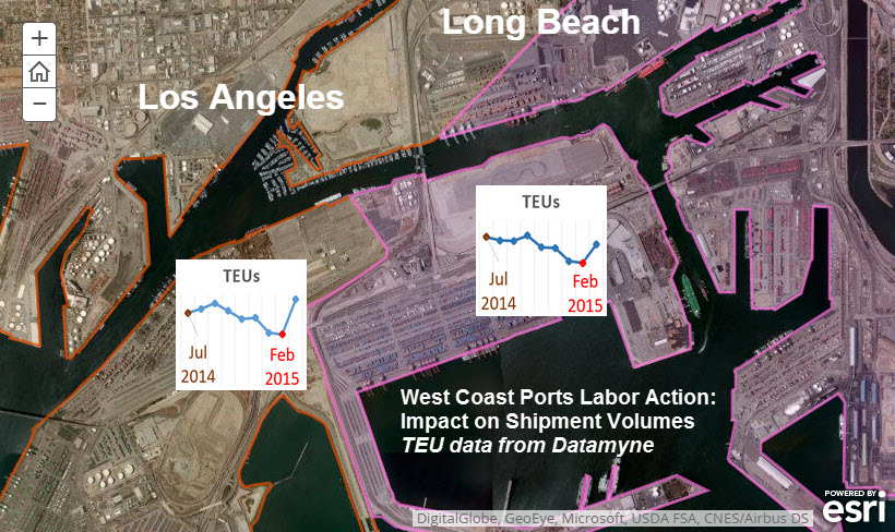 Our partners at Esri have used their GIS (geographic information systems) software to create a series of interactive story maps illustrating the impact of the West Coast ports’ slowdown during the dispute over terms of a new longshoremen’s contract. The old contract expired July 2014; agreement on a new one was not reached until February 2015.