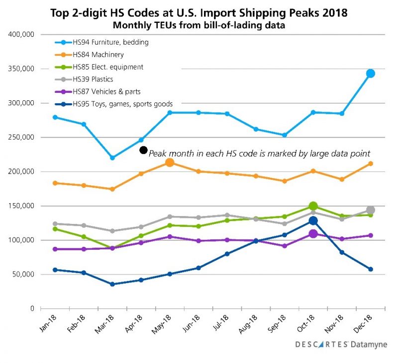 - In 2018, importers rushing to stock up ahead of then still pending tariffs helped lift peaks to record heights.