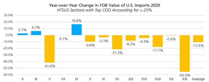 Descartes Datamyne data affirms this conclusion. For example, we compared gains and losses in U.S. imports in pandemic year 2020 between relatively diverse value chains (where the top country of origin accounted for a quarter or less of total import value), and those that depend more on fewer sources (imports for which the top COO claimed a share greater than 25%). Here are the results of the comparison at the level of the Harmonized System’s Sections: