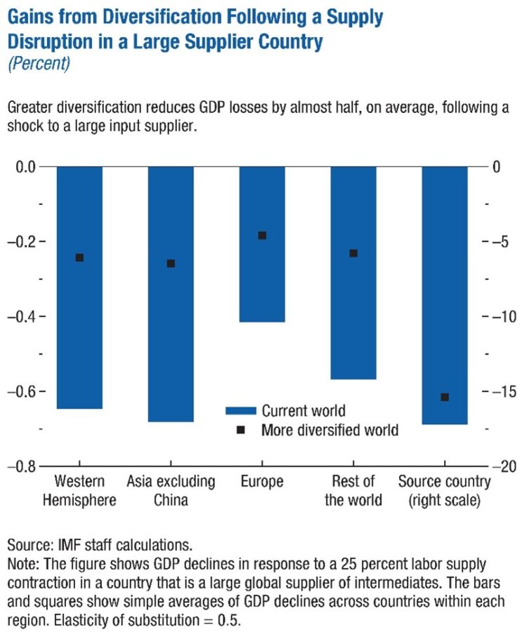The IMF analysis finds broad economic benefits of diversification. For example, given a 25% labor supply contraction in a single global supplier, the GDP of the average country falls 0.8%. In the IMF high-diversification scenario, the drop is cut nearly in half, as illustrated in this chart: