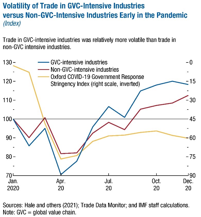 The IMF also compared trade volatility in industries that are “global value chain-intensive (GVC)” – that is, the automotive, electronics, textiles and apparel, and medical goods industries – versus those that are more dependent on near-shore or domestic suppliers during pandemic year 2020. They found that the stringency of government lockdowns correlated with the downturn in imports. The GVC-intensive industries experienced a sharper, deeper downturn as lockdown took effect, but rebounded faster and further as government restrictions eased, as this chart illustrates: