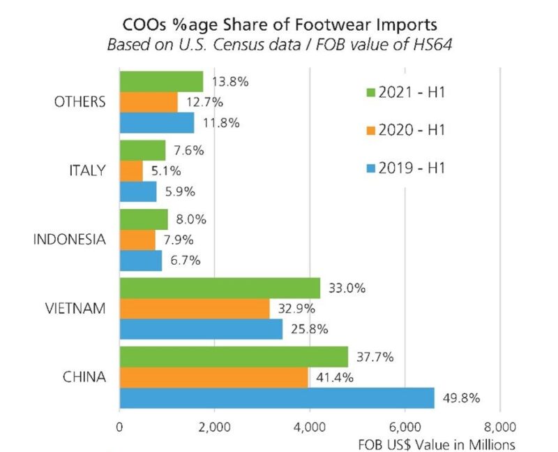 Descartes Datamyne global trade data affirms shifts in market share in U.S. import trade. For example, in the relatively GVC-intensive footwear sector [HS64], we found share shifting from China to other sources. Whether the pie was shrinking in 2020, or expanding in 2021, bigger slices went to Vietnam, Indonesia, and others, as this chart summarizes: