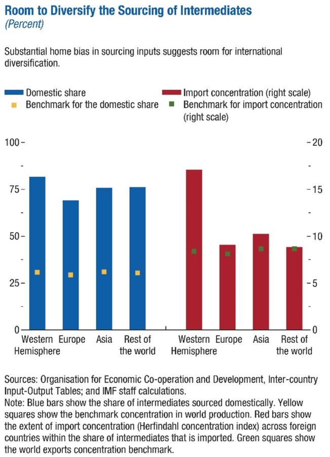 The IMF sees plenty of room for more diversification away from domestic suppliers to many more international sources. In fact, there is a significant “home bias” toward domestic sourcing of intermediate inputs.