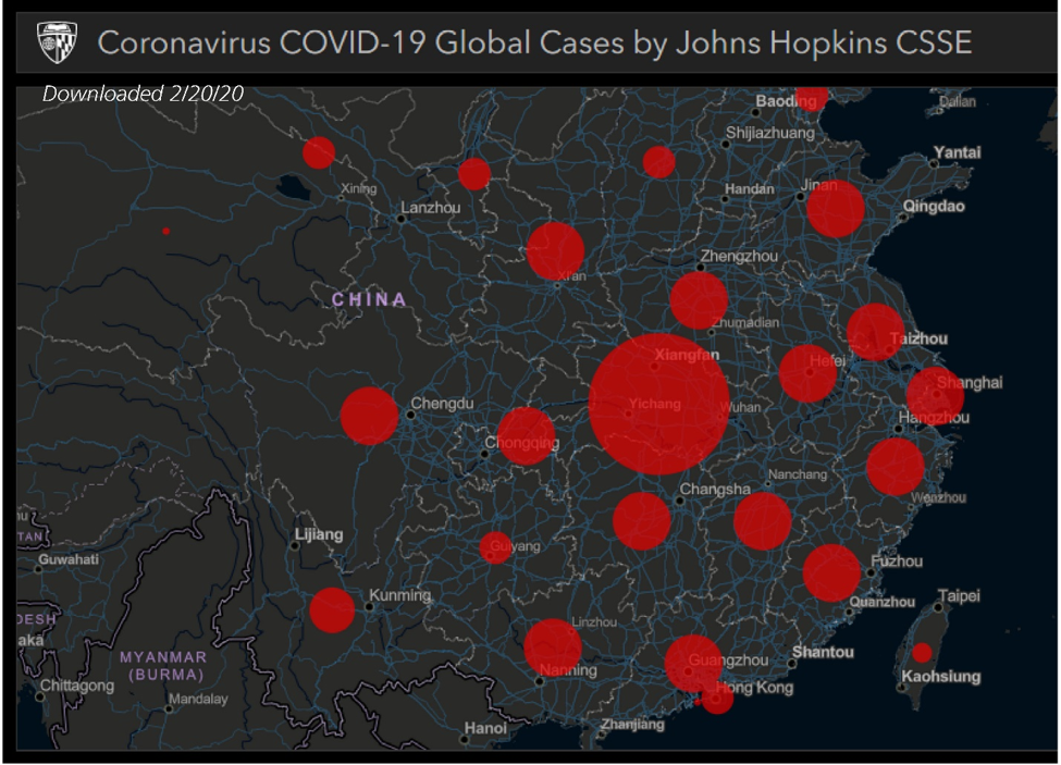 As the following map downloaded from Johns Hopkins on February 20 indicates, Hubei is ground zero for the Wuhan coronavirus, designated 2019-nCoV by the World Health Organization,