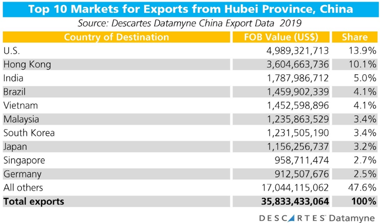 Much of this production is for domestic consumption. The top market for Hubei goods earmarked for export is the U.S., destination for 13.9% by value of trade last year. Here are Hubei’s top 10 markets, based on our China trade data: