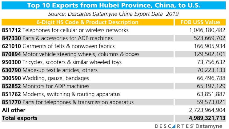 Hubei steps up in rank among Chinese production centers as a source for cell phones (at No. 7, accounting for 2.3% share in 2019) and parts for phones and transmission equipment (No. 6, with a 3.3% share). These products are an important part of the mix that goes to the U.S., as our data indicates:
