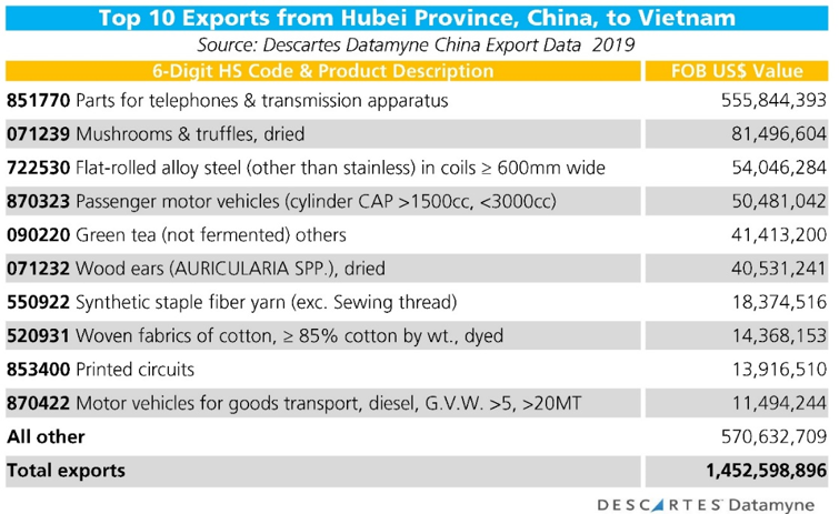 Note, too, our next table showing parts for telephones and transmission apparatus representing the biggest slice of Hubei’s exports bound for Vietnam – an indication that the Chinese province is an important link in supply chains for phone manufacturers in Vietnam. This bodes ill for U.S. importers relying on Vietnam as an alternate source for cell phones. The up-and-coming producer of phones accounted for nearly 20% of U.S. imports denoted HS851712 last year (China accounted for 72%). But with its input supply chains running through China, the Vietnamese industry is likely to see significant disruptions in production, even if the coronavirus remains contained. (So far, only a handful of cases of the disease have been reported in Da Nang.)