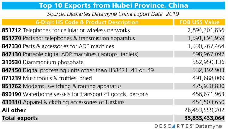Our trade data indicates that Hubei’s production for export is concentrated in electronics, a newer, growth industry for the early-to-industrialize province. Here are Hubei’s top 10 exports by value in 2019: