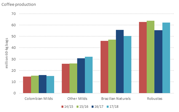 Coffee production overall is estimated to increase. Global production in 2017/18 is estimated at 159.66 million bags, 1.2% higher than 2016/17 with a 12.1% increase in Robusta output offsetting a 4.6% decline in Arabica production.