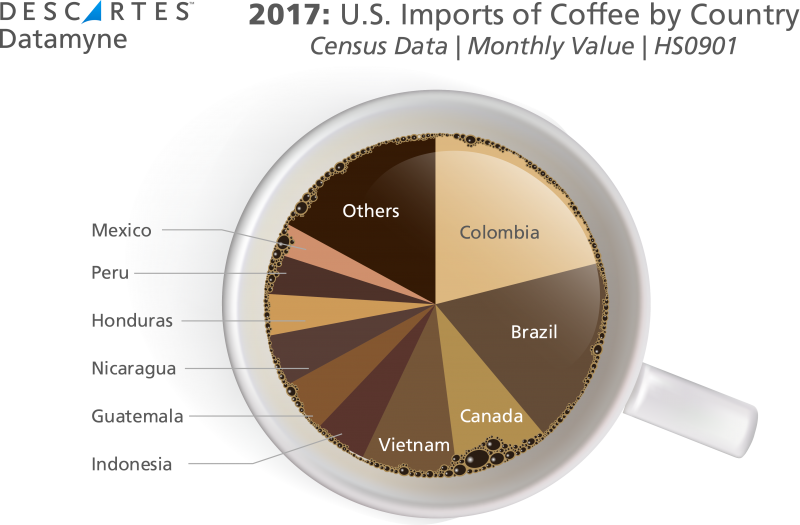 - Descartes Datamyne Market Insight™ for the Coffee Industry: This solution provides earlier indicators of supply and demand trends for coffee brokers, traders, buyers, retailers and others looking to stay ahead of the market. Our U.S. import data captures each shipment’s importer, supplier, origin, destination and more while our international data captures players, quantities, volumes and prices (varies depending on country). Data is cleansed, standardized and enhanced with product descriptions including varieties and certification types where available. Ask for a demo.