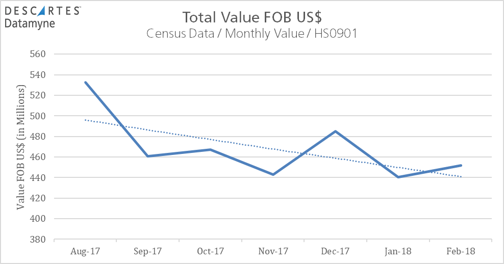 This is especially apparent in the value of coffee imports to the United States. The decline is further confirmed by data from Descartes Datamyne™, which shows only a modest 2.65% increase in import value in January and February after a 17.36% drop in value since August. Total import value in December dropped to its lowest value since 2016. The industry is also keeping a close watch on how the popularity of cold brew coffee could boost future profits.