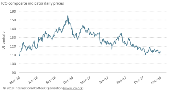 The value of the the total coffee imports and exports continues to decline. Since August 2017, the International Coffee Organization indicator price has declined in each month except January. The price has further decreased by 1.1% in March 2018 to an average of $1.129 USD/lb, which is the lowest monthly price since February 2016.