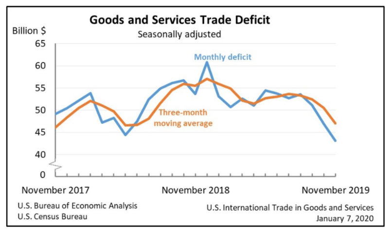Earlier this month, the Census Bureau and the U.S. Bureau of Economic Analysis reported that the goods and services deficit had fallen to a three-year low of $43.1 billion in November, down $3.9 billion from October’s $46.9 billion. Year-to-date, the goods and services deficit decreased $3.9 billion, or 0.7 percent, from the same period in 2018.