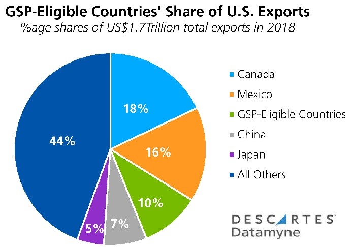 There are currently 103 independent countries and 17 non-independent countries and territories listed as eligible beneficiaries of GSP. Taken together, these trade partners accounted for 9.1% of U.S. imports by value and 9.92% of exports in 2018, based on Descartes Datamyne trade data (and illustrated in the next charts).