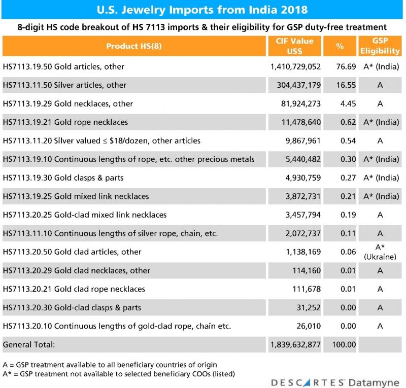 There are 8-digit HS coded products in the category of jewelry, made from or clad in precious metals, that are GSP-eligible. However, many of these are not eligible for duty-free entry when sourced from India – starting with HS71131950 gold articles, other, which accounts for 77% of U.S. jewelry imports from India, as the table shows: