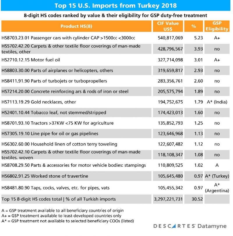 Here’s a closer look at the top 15 U.S. imports from Turkey along with their GSP status: