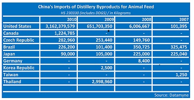 The leading customer for U.S. DDGS is China, taking in about 40% of exports last year. And the U.S. has become, very rapidly, China’s primary source for DDGS [see the table below] – prompting China to announce an antidumping investigation into its U.S. DDGS imports at year-end 2010. The U.S. Grains Council reports helping almost 70 U.S. companies to register as interested parties to the investigation. According to the USGC, provisional tariffs on DDGS could begin as early as June 2011. China’s decision on its findings is due December 28, 2011, though that deadline can be extended by six months.