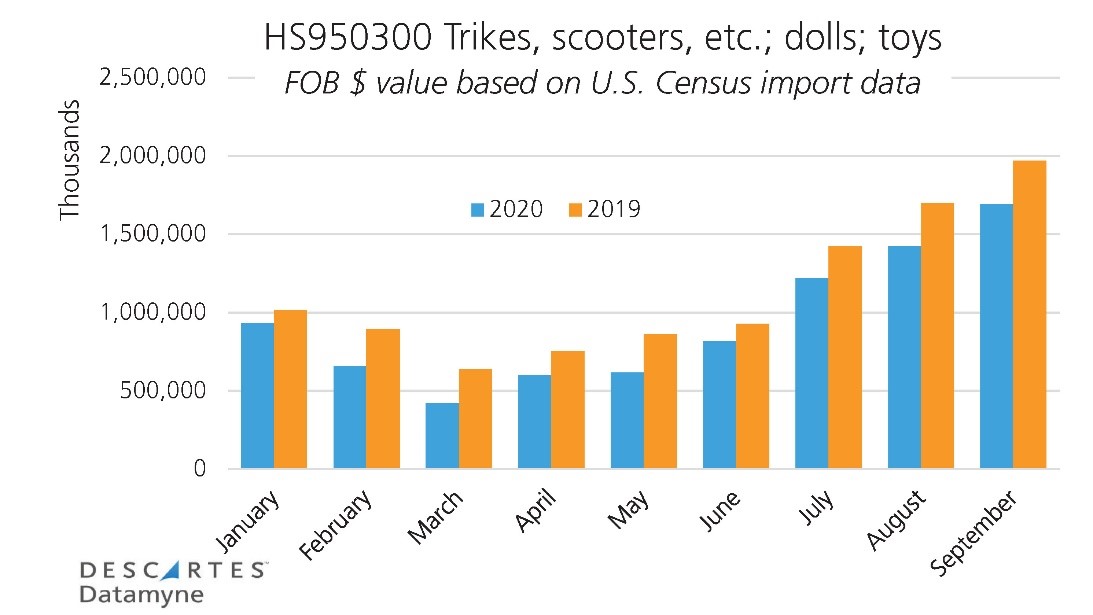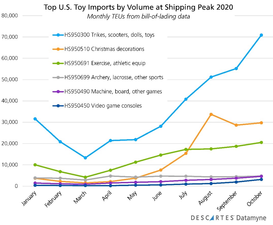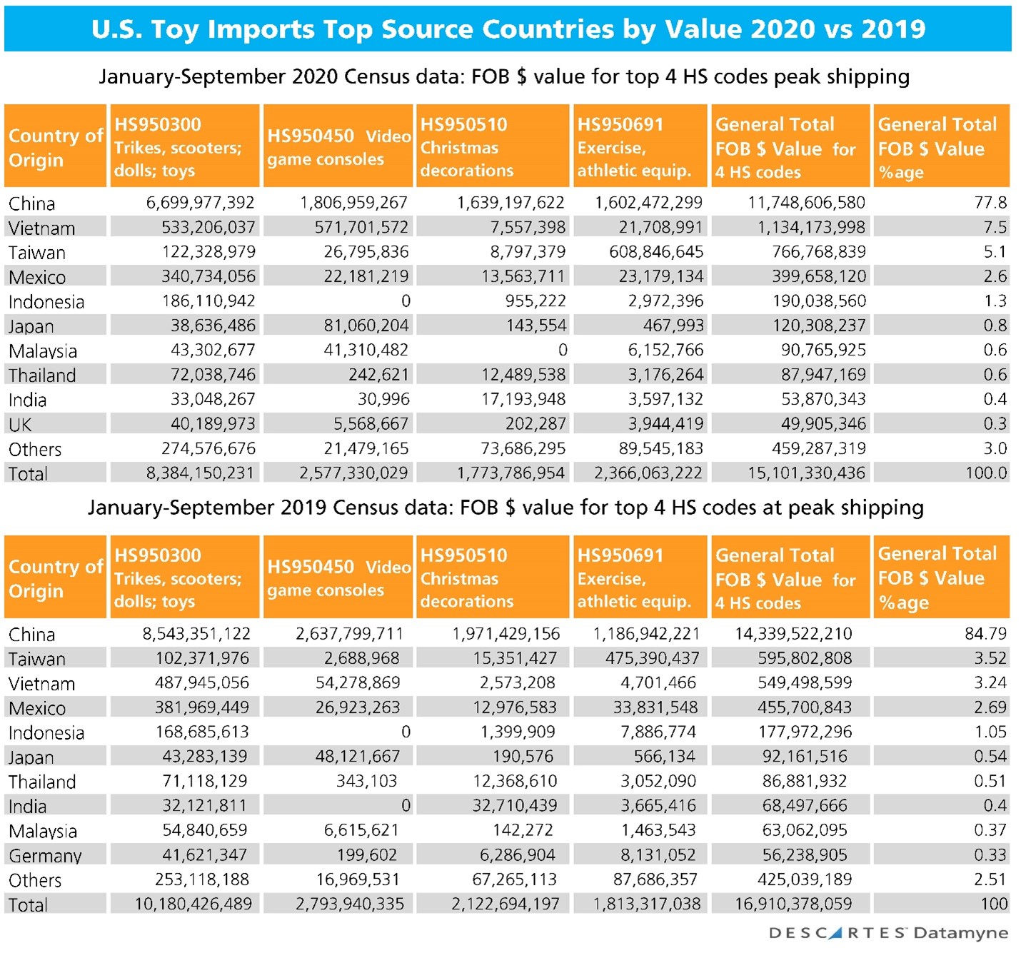 Our bill-of-lading data establishes China as the pre-eminent source of containerized toy imports – 39% of the overall product category (HS95) and 76.6% of children’s toys (HS950300) on average in the first 10 months of 2020.