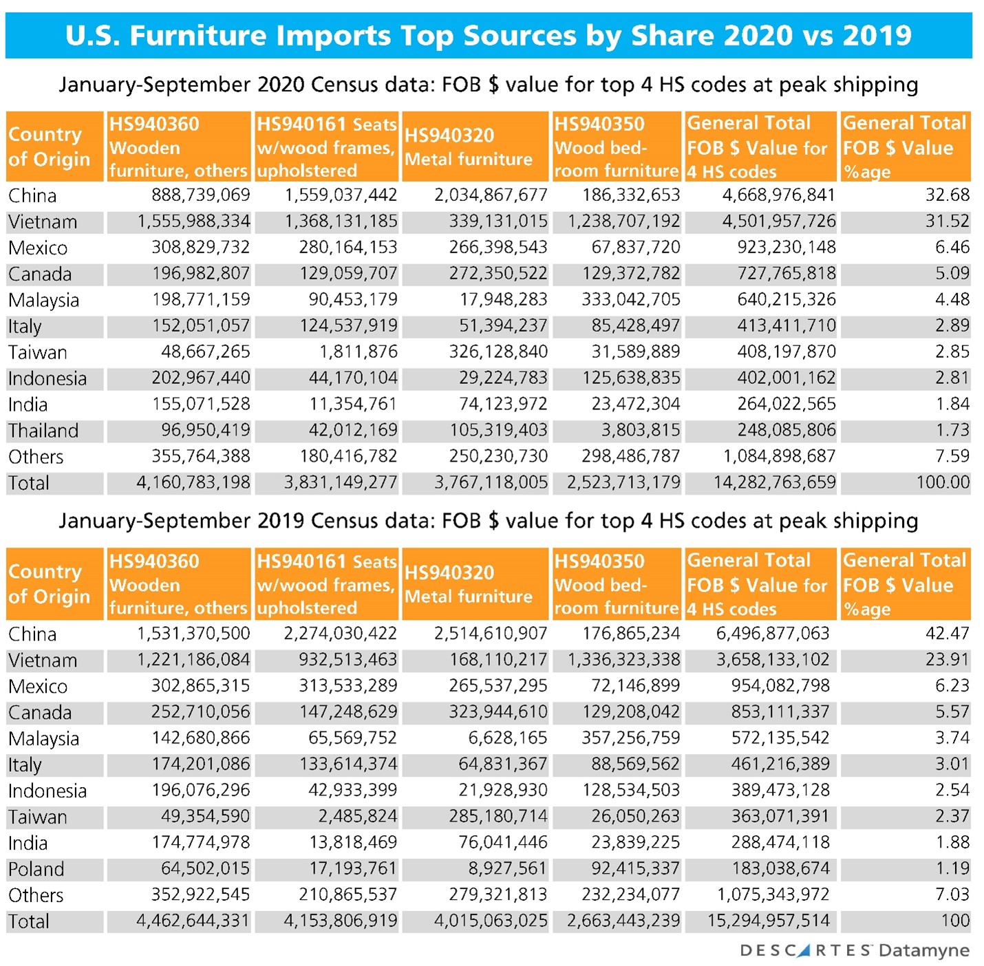 China still holds the lead over other countries of origin for the peak season’s high-demand furniture products in this view – but China’s share scales down to 42.5% in 2019 and 32.7% in 2020. The data also reveals shifts in centers of production: note the near parity in output of upholstered chairs by China and Vietnam. China is eclipsed by Vietnam in wooden furniture, others; and wooden bedroom furniture.