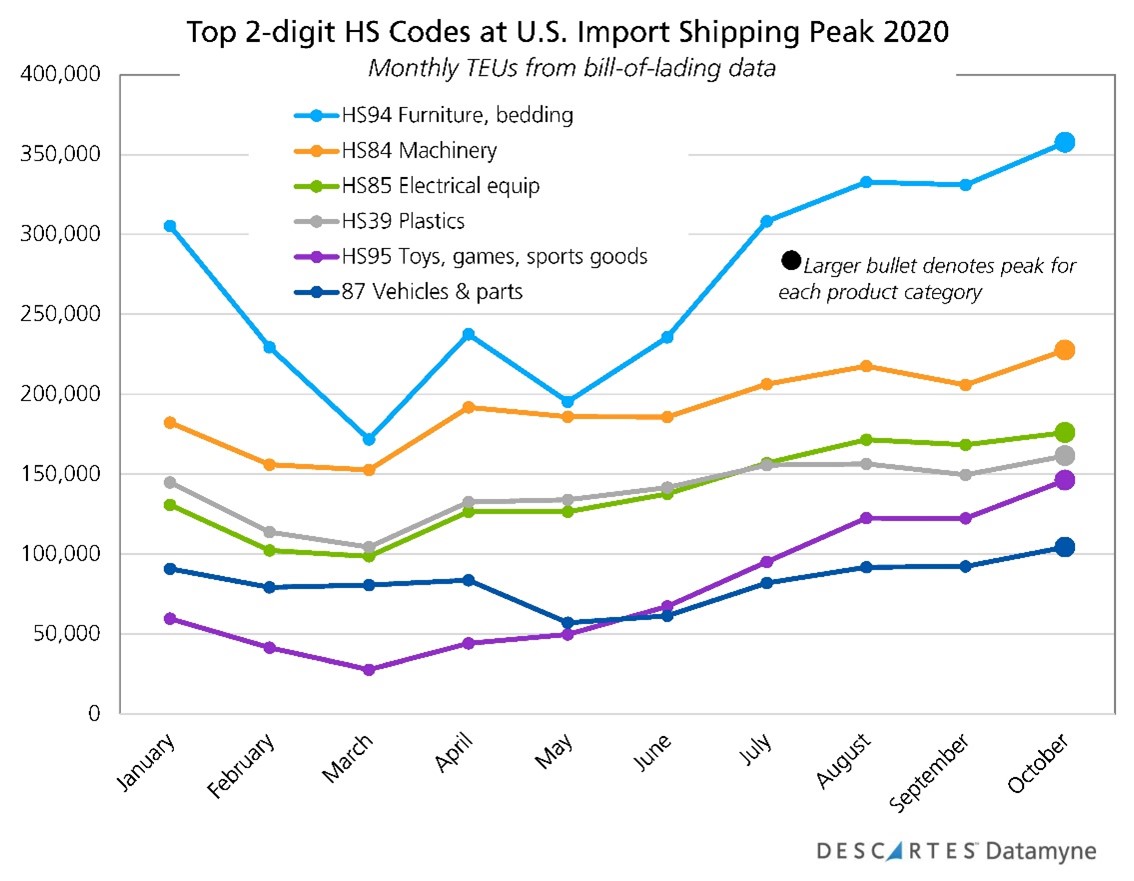 Not surprisingly, pandemic-related shut-downs have pushed shipments in the top containerized import product categories (as denoted by two-digit harmonized system tariff codes) to peak in October, as shown here: