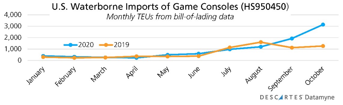 Note: video game consoles rank sixth among U.S. toy imports by volume, according to Bill of Lading data. We are particularly interested in shipping data on this product because two of the industry’s top rivals targeted this November to launch their next-generation consoles.
