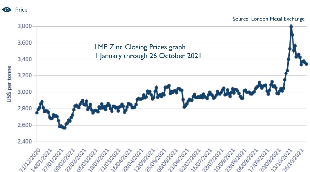 For the most part, the gains in export trade dollar value are greater in magnitude than the gains in quantity shipped – or, in the cases of base metal tools [HS82] and base metals, others [HS81], are achieved despite a downturn in quantity. In other words, exporters were able to sell less metal for more money. The exception is zinc. As the London Metal Exchange graph below shows, the price of zinc has hovered around $3K/ton since May, with a big surge in October.