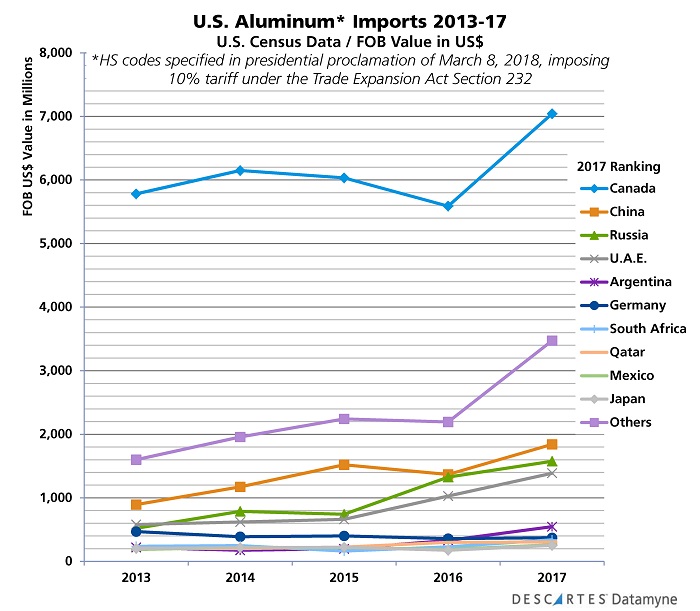Our trade data shows Canada is the leading source for U.S. imports of the aluminum HS codes subject to the new tariffs.