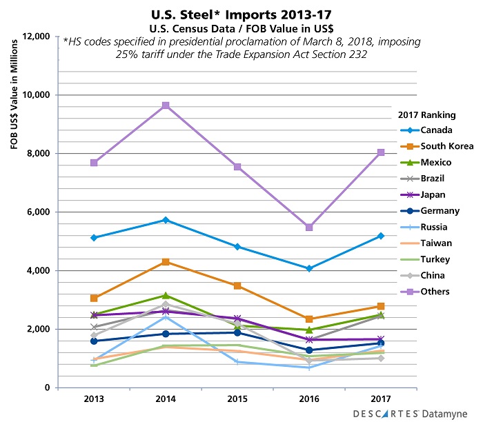 Again, the data puts Canada in the lead as a source for steel imports, accounting for 17.9% by value in 2017. Mexico, ranked third, accounted for 8.6%.