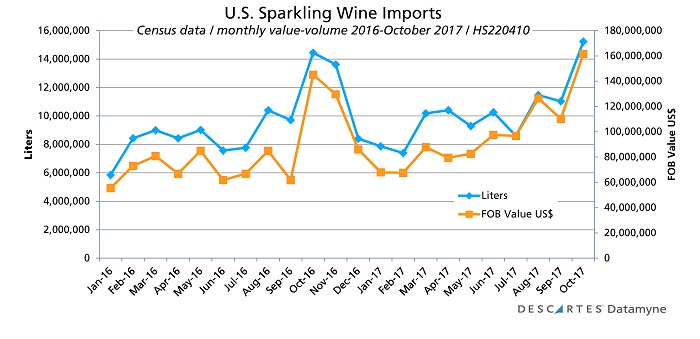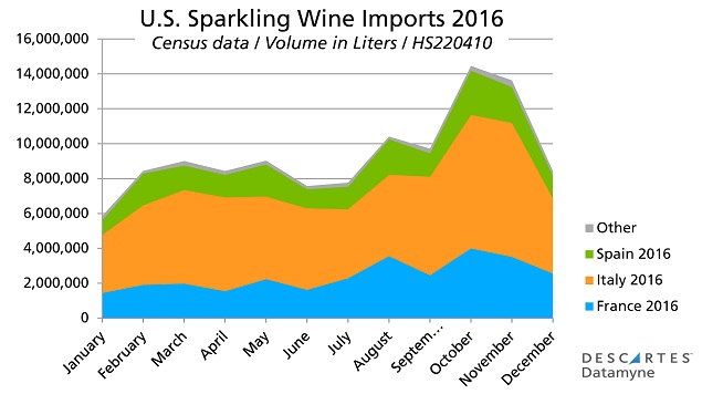 U.S. sparkling wine imports continue to rise, data from Descartes Datamyne reveals. Champagne still provides a year-end holiday lift, but Spain’s cava and – especially – Italy’s prosecco are boosting volumes all year round.